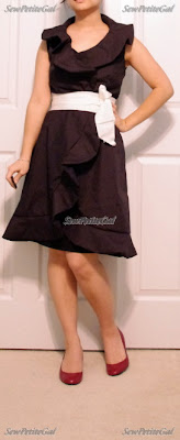 I absolutely love the drama of the neck collar and the contrasting sash color.  Hubby remarked, "That looks a bit much.  Are you going to wear it to the office?"  So yes, I admit, it's a little dressier than what I would normally wear.  But I think you can always make it more casual with a cardigan.  Accessorizing makes all the difference too.