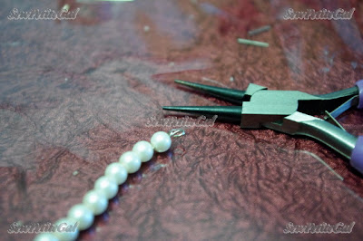Split each package of pearls into 2 even groups and string each (2 packages of 2 groups each = 4 strings of pearls). Knot your thread and add a crimp tube to prevent the pearls from sliding off the thread.