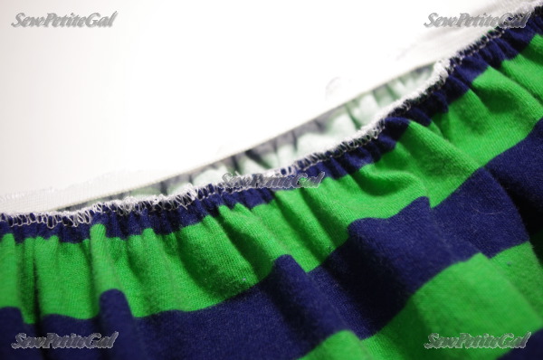 ALTERNATIVELY, for regular sewing machines, fold the waist over the elastic band to create a casing and stitch along the bottom. To prevent elastic flipping, you can stitch / backstitch / stitch with matching thread along the side seams to hold it in place. I usually go 3 forward, 3 back, and 3 forward to secure. Go ahead and skip to Step 8.